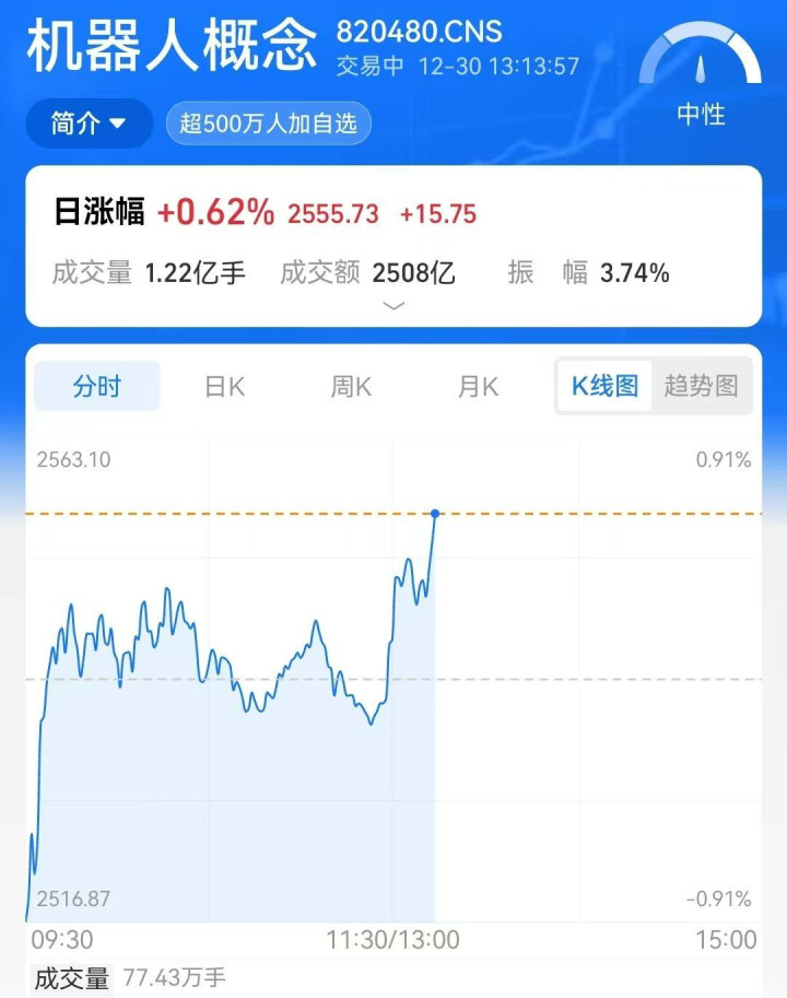 今天(12月30日)早盘,A股机器人板块低开高走,上演一波强势涨停潮。天铭科技30cm涨停,五洲新春直线封板,板块内超10%涨幅个股达18只,临近午盘更是出现集体拉升。这波行情是否意味着机器人赛道的热度正式回归?背后是产业逻辑支撑,还是短期情绪催化?