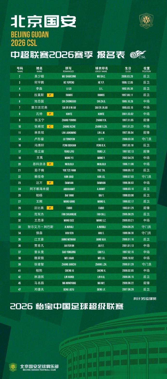 直播吧3月3日讯国安官方公布新赛季中超名单及球员号码,韩佳奇改穿22号,无斯帕吉奇。