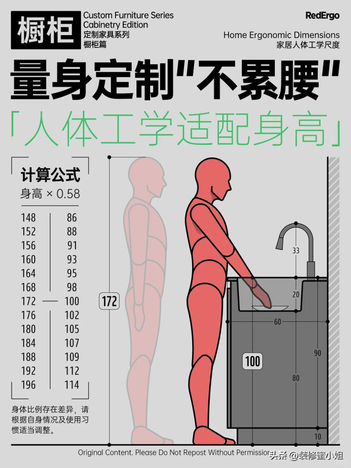 如果你不清楚家中的台面高度该如何选择时,不妨看看下图所示的计算方法,设计出更符合你日常所需的台面高度。